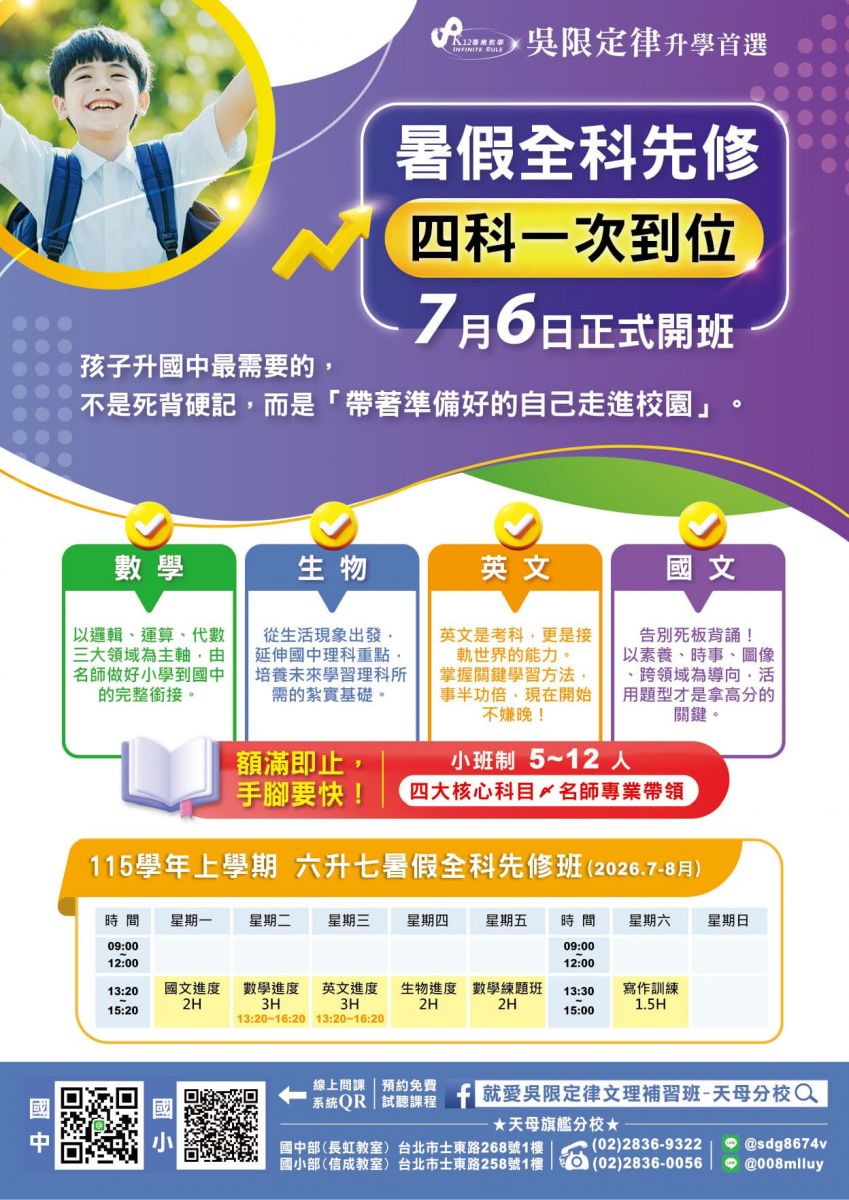 天母分校~六升七【全科】暑假先修班, 7月6日正式啟動!